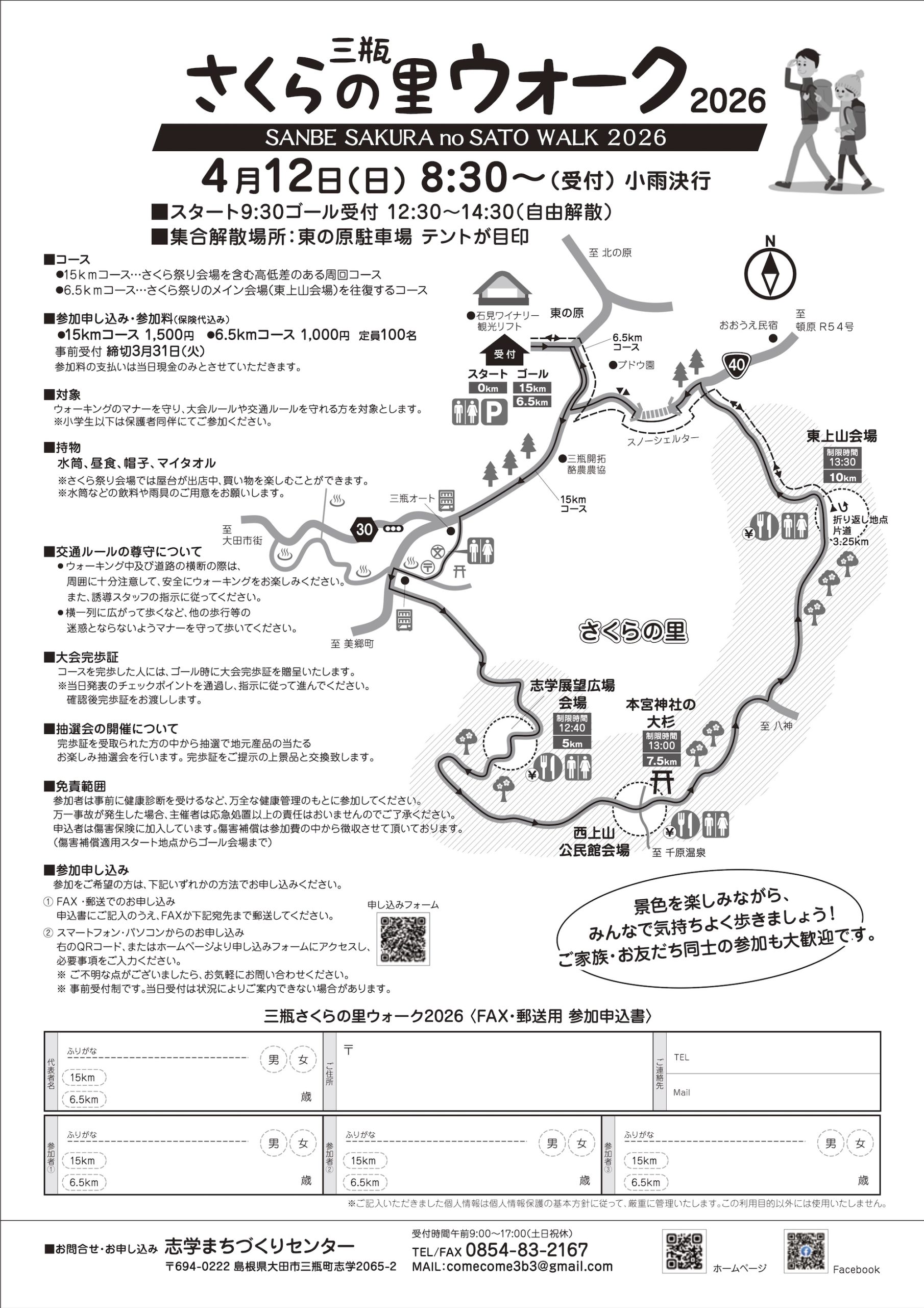 私たちの地域では20年前ごろから地域を桜を植え地域をたくさんの人に訪れてもらい、志学地域の良さを知ってもらい毎年志学を訪れて欲しい。という思いで山桜を約10年をかけ約6,500本植えてきました。その桜が咲く4月に毎年お祭りを行っています。そしてこのイベントに合わせワーキング大会も行っています。三瓶の春を感じて自分の足で三瓶地域を歩く。次もとの人との出会いや会話、そしてウォーキングコースは桜祭りの会場を歩くコースとなっています。年に一度しかない特別な時間とコースです。ぜひ歩いて見ませんか?歩いた後の温泉はサイコーですよ。詳しくはウォーキングのサイトをご覧ください。